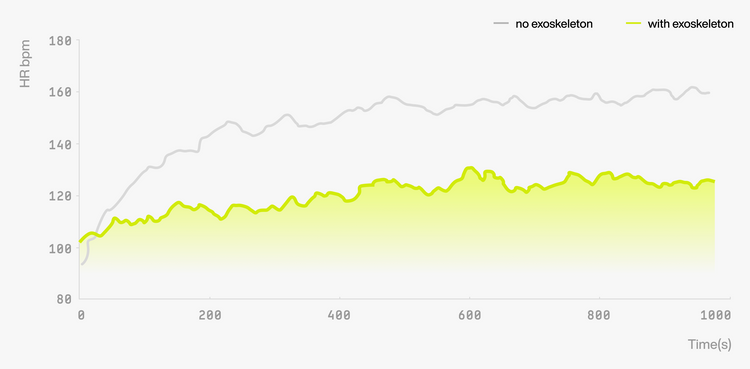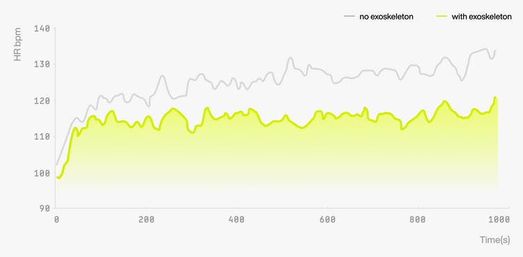 2. 사이클링 중 심박수 및 산소 소비량 감소 수치는, 외골격을 최적 보조 설정으로 구성한 상태에서 실험실 환경의 실내 사이클링 테스트를 통해 측정되었습니다. 외골격 보조 없이 사이클링했을 때와 비교하여, 평균 심박수는 42.7%, 산소 소비량은 39.2% 감소하였습니다. 해당 데이터는 통제된 실험실 조건에서 수집되었으며, 실제 사용 시 성능은 환경 조건, 지형, 하중, 사용자 상태, 주행 스타일, 자전거 모델 등에 따라 달라질 수 있습니다.