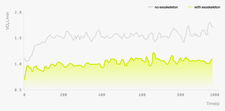 3. 보행 중 심박수, 산소 소비량 및 근육 부하 감소 수치는, 외골격을 최적 보조 설정으로 구성하고 표면 근전도(EMG)를 사용하여, 경사도 7°, 속도 3.5km/h의 트레드밀 보행 조건에서 실험실 환경에서 측정되었습니다. 외골격 보조 없이 보행했을 때와 비교하여, 평균 심박수는 22.3%, 산소 소비량은 20.5% 감소하였으며, 스윙 단계에서 장요근 및 대퇴직근의 근활성도가 최대 63.7%까지 감소하여 피로 신호 기준으로 근육 부하 감소가 확인되었습니다. 해당 데이터는 통제된 실험실 조건에서 수집되었으며, 실제 성능은 환경 조건, 지형, 하중, 사용자 생리 특성 및 보행 스타일에 따라 달라질 수 있습니다.