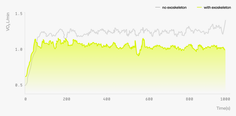 몸이 움직이기 위해 소모하는 "대사 부담(Metabolic Cost)"을 나타냅니다. 산소 소비량이 낮을수록 피로는 줄고, 효율은 높아지며, 동일한 체력으로 더 먼 거리를 이동할 수 있습니다.